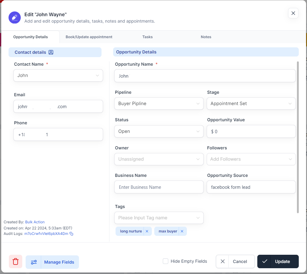 Robust data management within opportunities tracks opportunity source, contact details, opportunity value, and notes.
